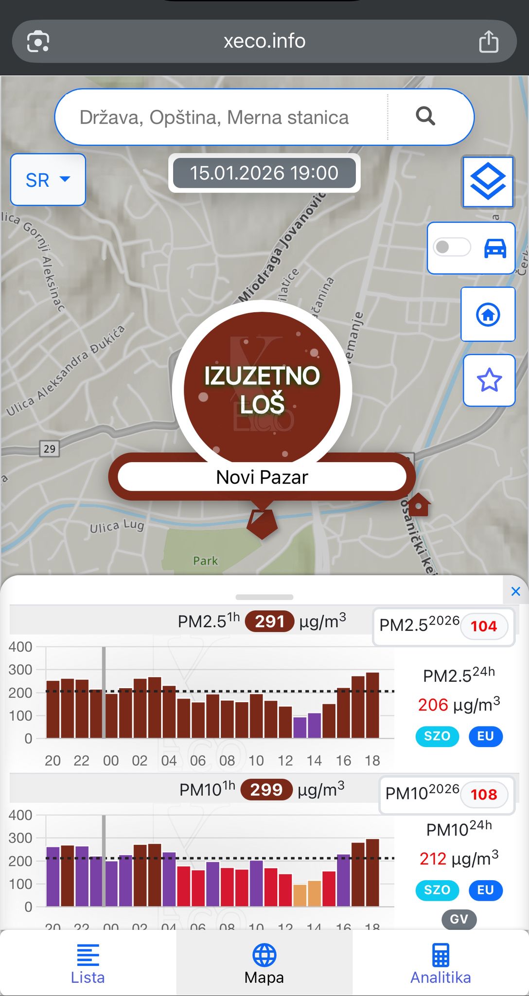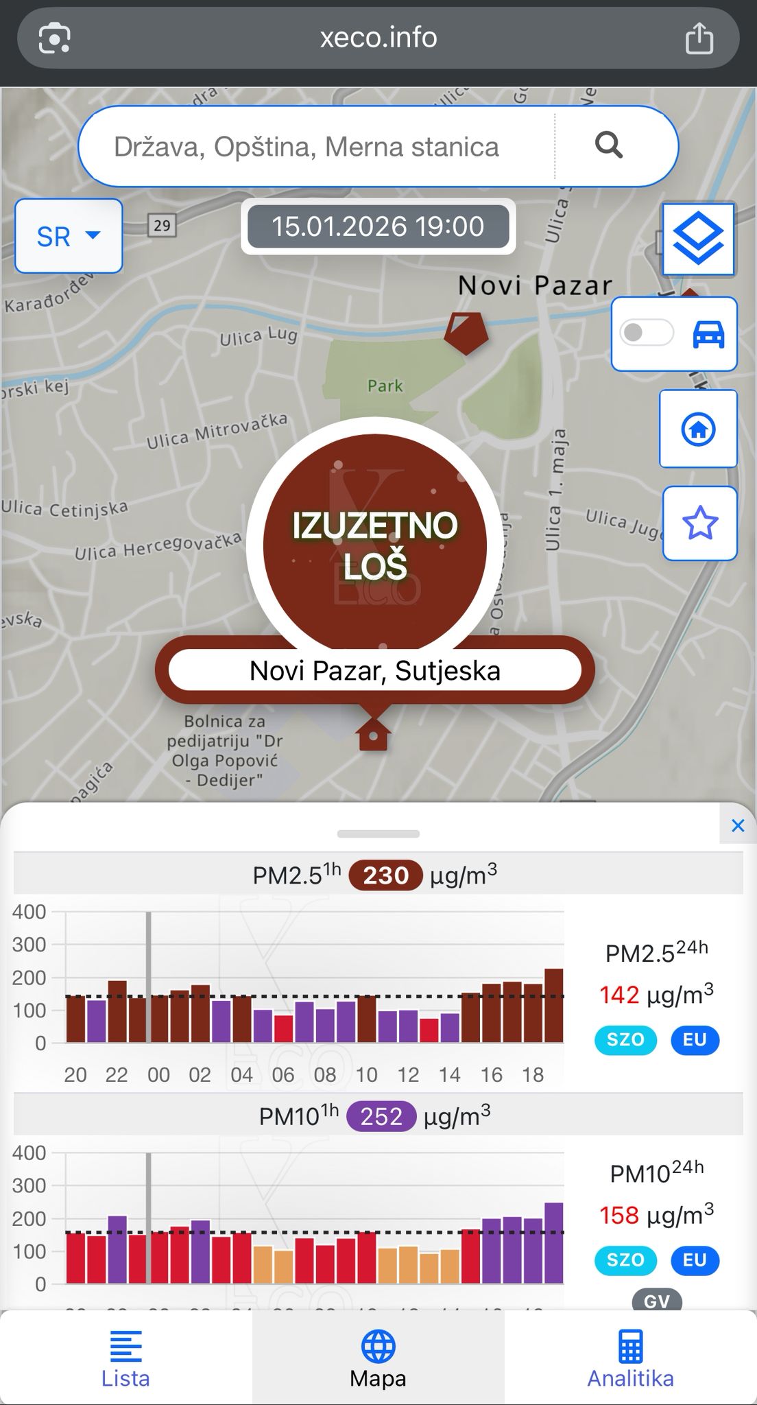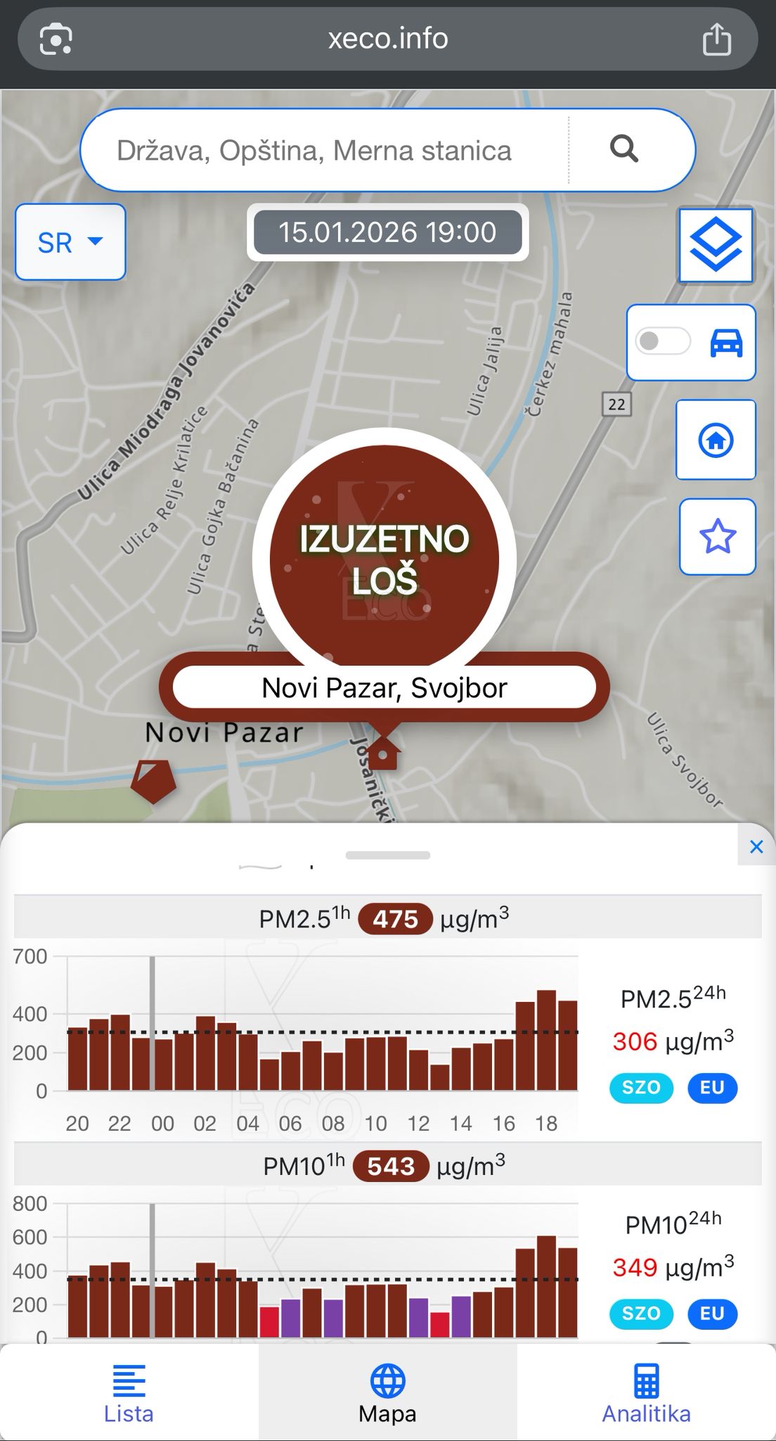 Večerašnji podaci sa aplikacije xEco (15.01. u 19h) pokazuju zastrašujuću sliku mikroklimatskih razlika u Novom Pazaru. Dok je u centru grada situacija “izuzetno loša”, u naselju Svojbor vazduh je postao toksičan.