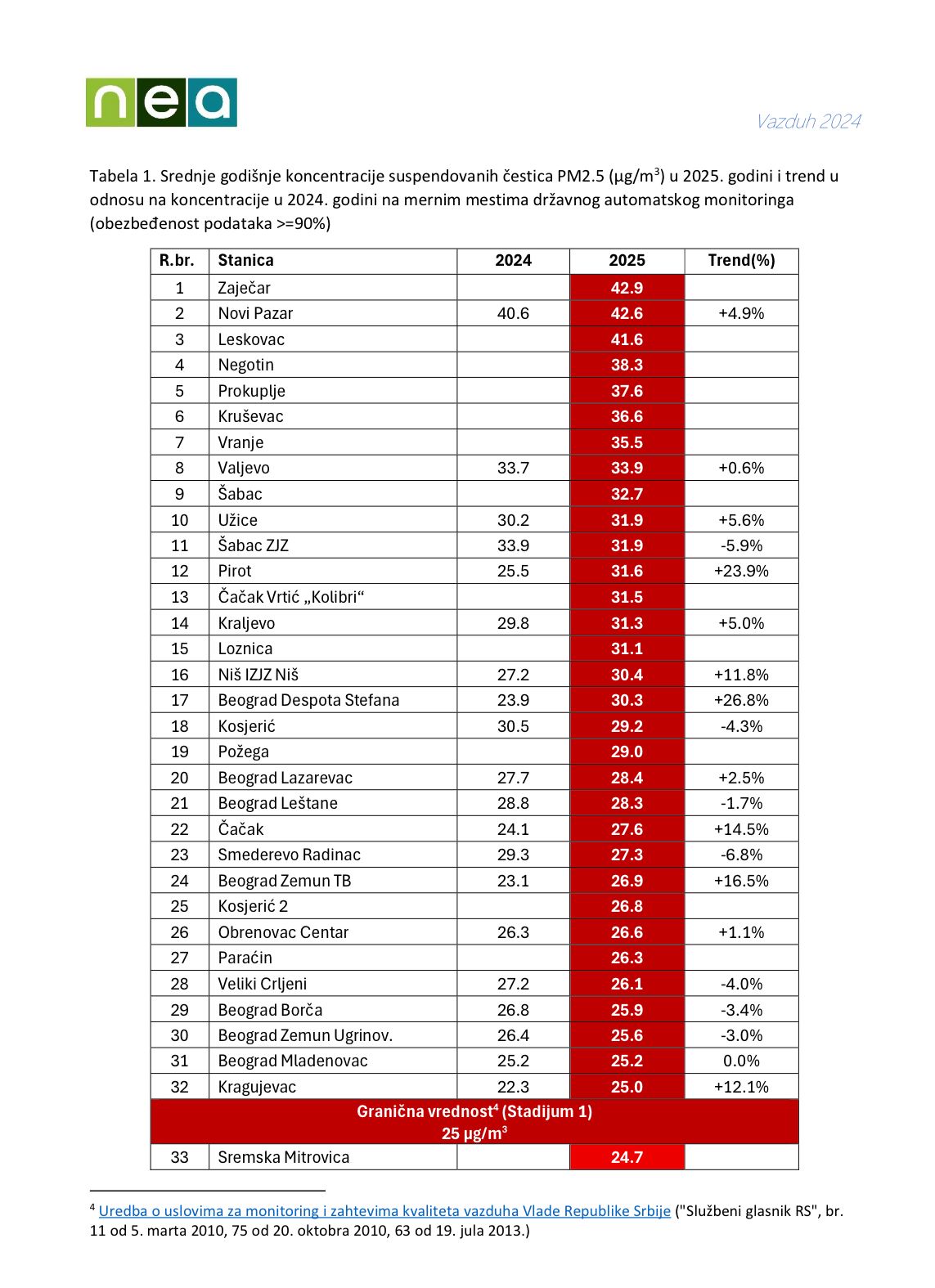 Ovaj večerašnji skok nije izolovan incident. Prema podacima Nacionalne ekološke asocijacije (NEA), Novi Pazar je 2025. godinu završio sa lošijim rezultatima nego prijethodnu: - Srednja godišnja koncentracija PM2.5 porasla je na 42,6 µg/m³ (u 2024. bila je 40,6 µg/m³).